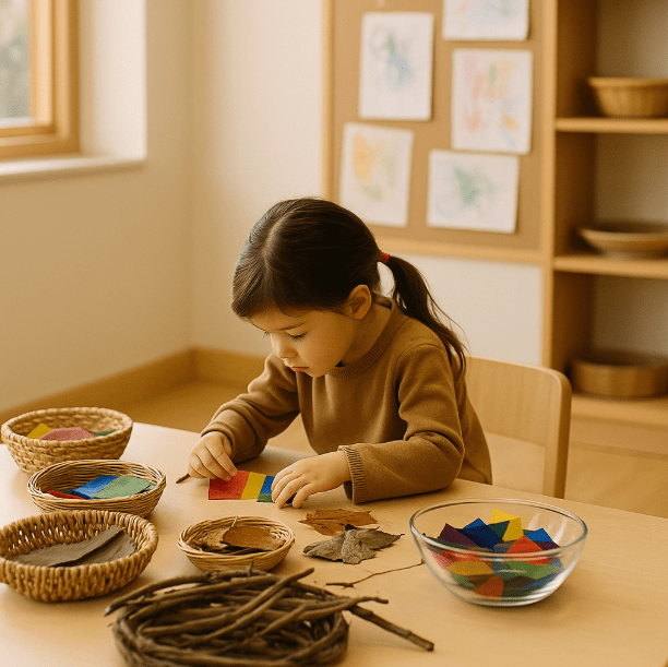 예를 들어, 교실 한켠에 준비된 나뭇가지, 천 조각, 유리판, 색깔 셀로판지 같은 다양한 재료들은 아이에게 상상하고 조합하며 탐색할 수 있는 기회를 줍니다. 그 공간 속에서 아이는 단순히 노는 것을 넘어, 재료(감촉, 무게, 소리 등)들을 직접 경험하며 그 재료가 가진 성질을 탐색하고, 그 속에서 자신의 생각이나 감정을 투영해보며 의미를 만들어갑니다.